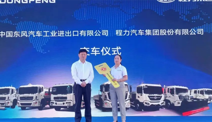 隨后,中國東風(fēng)汽車工業(yè)進(jìn)出口有限公司商用車海外營銷部中重型產(chǎn)品總監(jiān)吳永剛與程力集團(tuán)國際市場部業(yè)務(wù)經(jīng)理陳葦舉行了交車鎖匙牌授牌儀式。